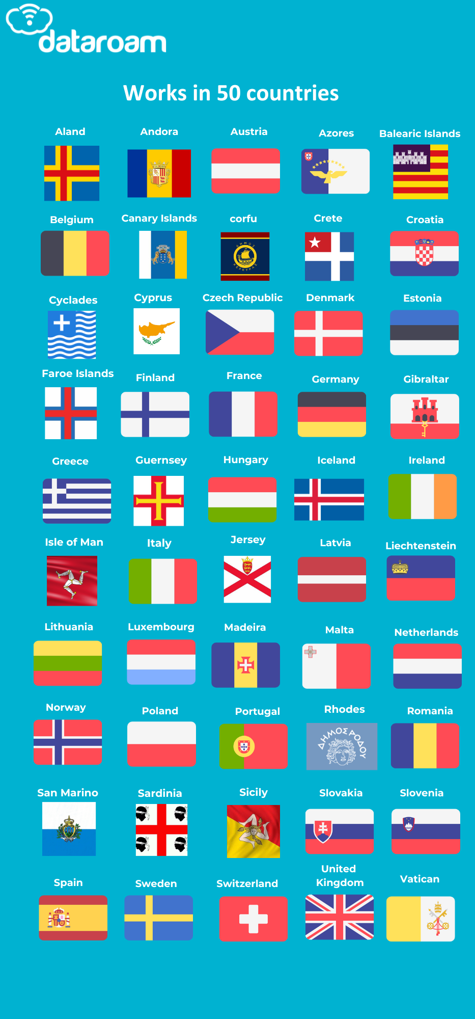 Dataroam's 25GB eSIM is the perfect connectivity solution when visiting Europe. A complete list of countries is as follows: